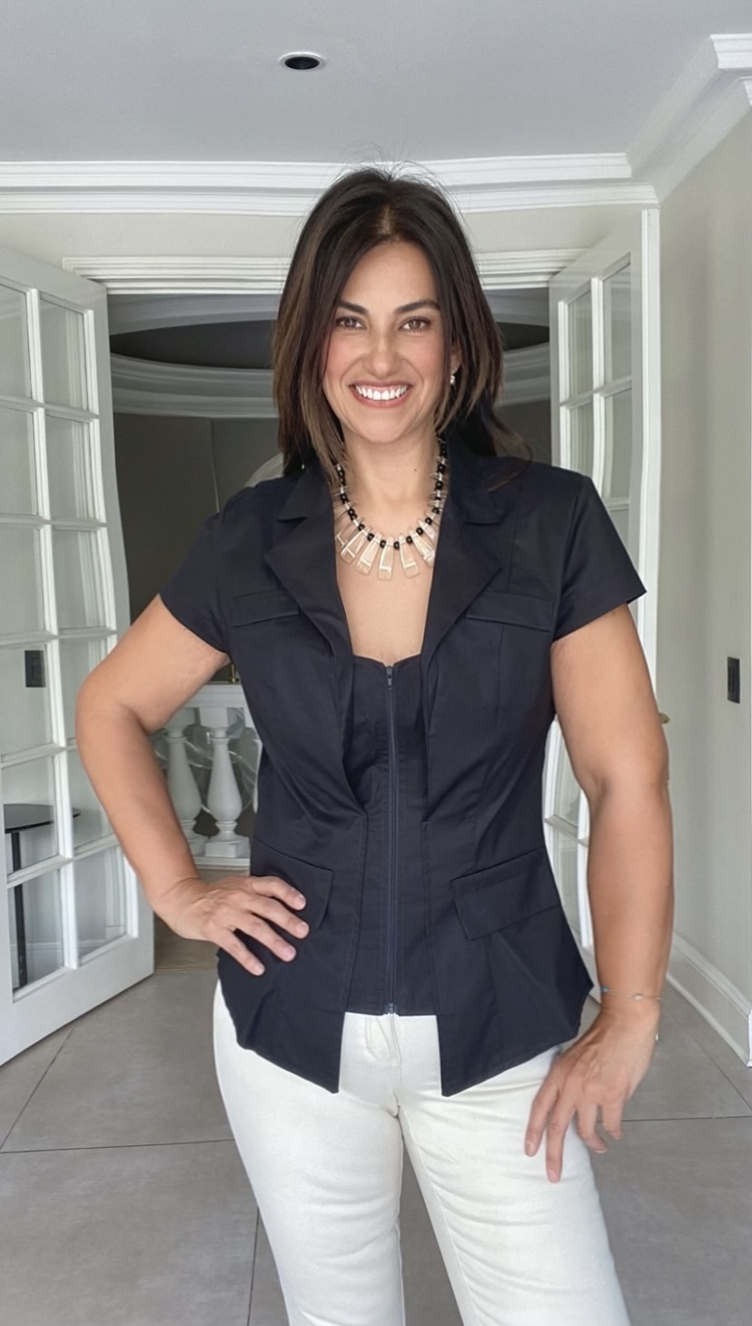 - CHAQUETA NEGRA es una camisa con un corte muy particular ya que semeja a una chaqueta blazer, dando como resultado un corte armonioso y elegante. De manga corta, es una prenda ideal para esta temporada de calor. Inspiración romántica, clásica y minimalista al mismo tiempo. Esta es una blusa cómoda y que hace mucha figura por su corte acinturada y finalización acampanada. Un modelo Versátil que puedes usar de diferentes formas según el estilo que quieras llevar, elegante, casual, deportiva.