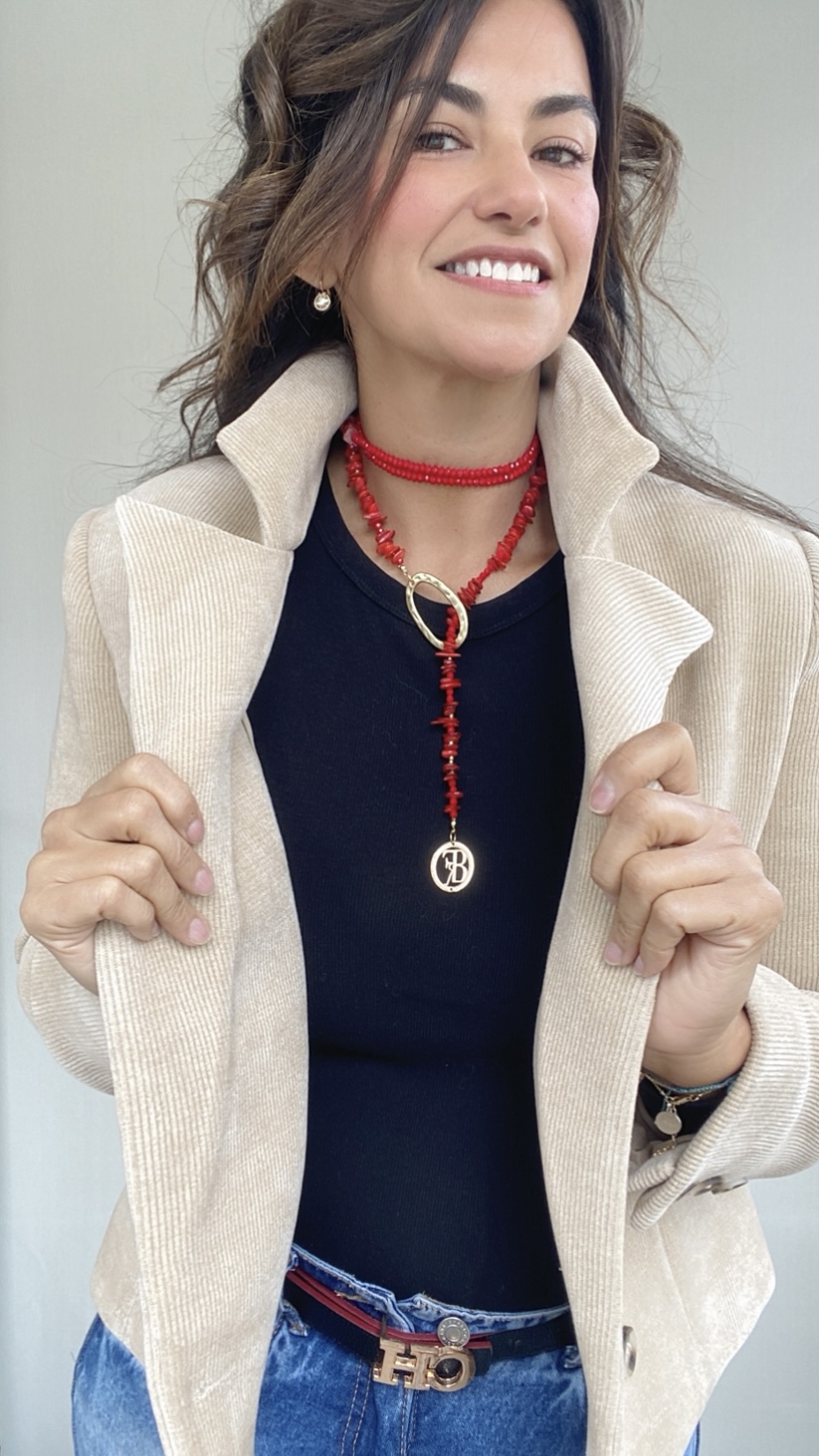 Acabado metálico dorado con piedra naturales rojas y mostacillas doradas / Medidas: 110 cm de longitud / Incluye su caja de presentación – protectora FRB Art.